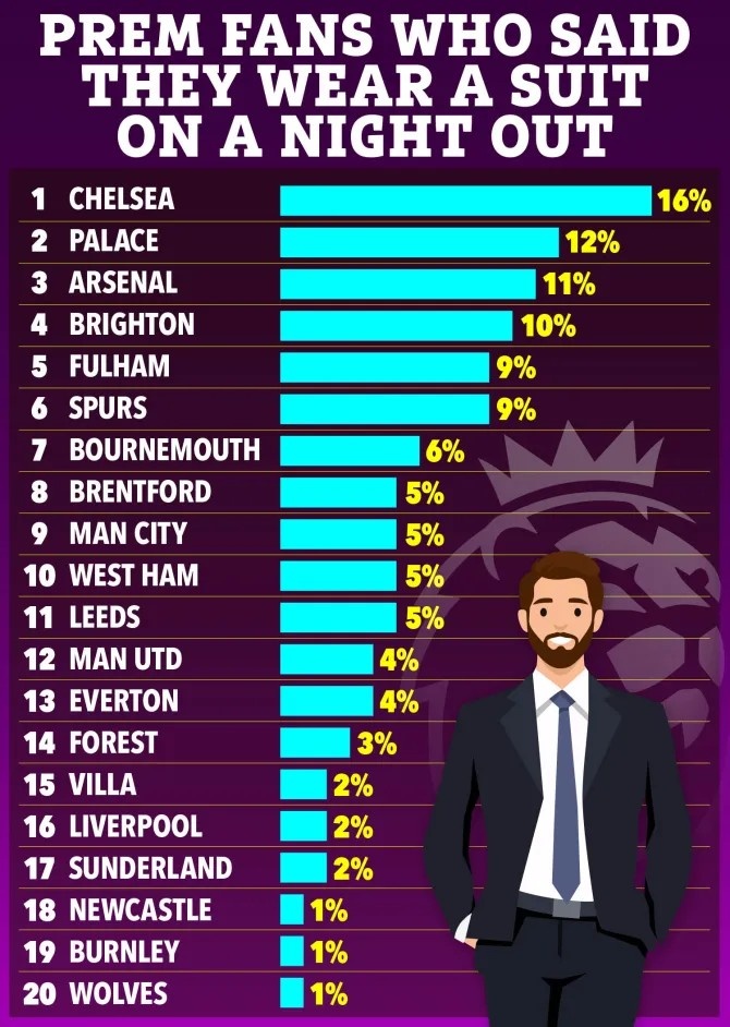 与此形成鲜明对比的是,位于北方的纽卡斯尔、伯恩利和狼队的球迷则相对保守,只有1%的支持者选择在夜晚赴会时正装出行,彰显了不同文化背景下的着装习惯。