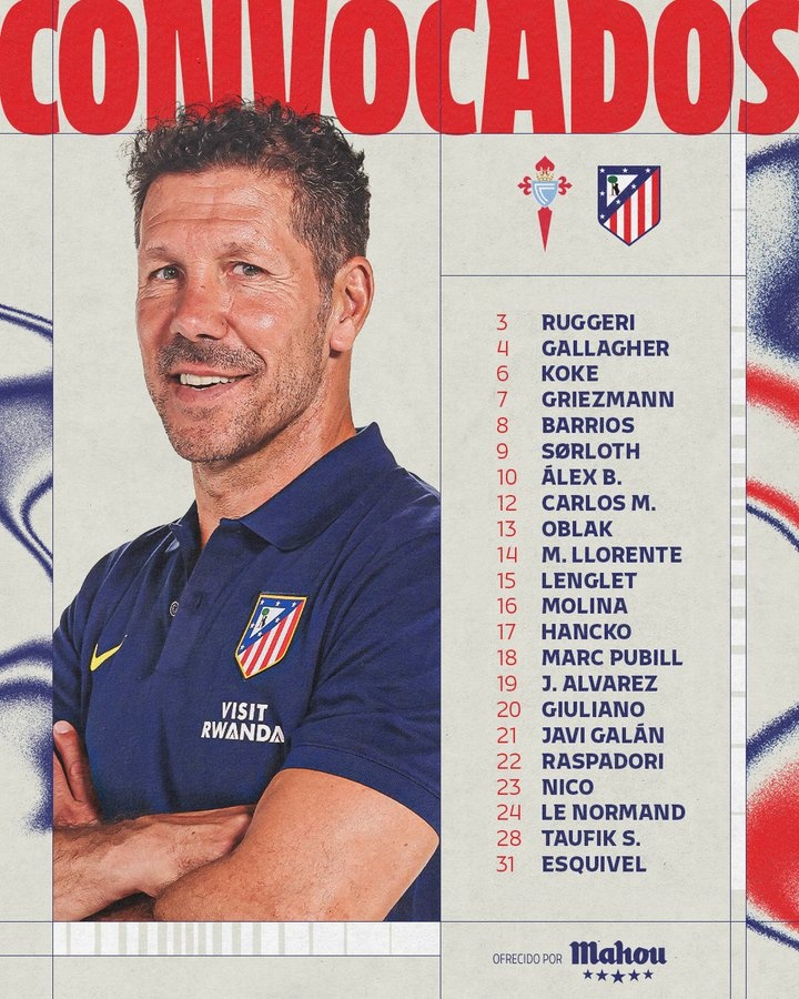马德里竞技对阵塞尔塔阵容公布 阿尔瓦雷斯与格列兹曼担当重任 穆索因身体不适缺席_西甲直播