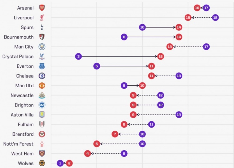 英超球队本赛季与上赛季同期积分对比:水晶宫增9分阿森纳减1分利物浦减3分_英超直播